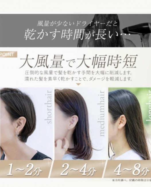 ●圧倒的な風量の高速マイクロモーターで速乾! 毎分11万回転の高速マイクロモーターを採用。パワフルなのにモーター音が小さく、 強力な風量と風圧をバランスよくコントロールし、髪を素早く乾かします。 圧倒的な風量で髪を乾かす手間を大幅に削減し、素早く乾かすことでダメージを軽減します。